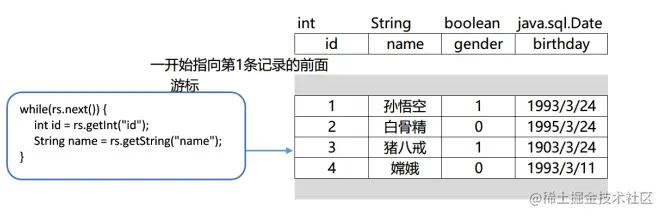 stmt.executeQuery(sql):返回一个查询的结果集。用于发送DQL语句,执行查询操作,select