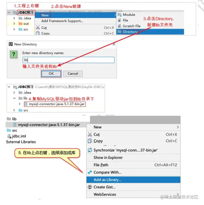- 导入jar包 druid-1.0.9.jar和mysql-connector-java-5.1.37-bin.jar。新建一个libs目录,然后右键add as library,引入项目中.