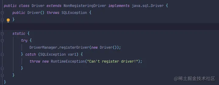 为什么这行代码可以注册驱动。通过查看Driver类的源码发现它在装载这个类时会自动注册驱动。