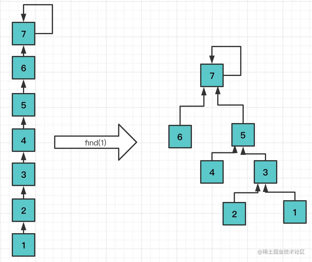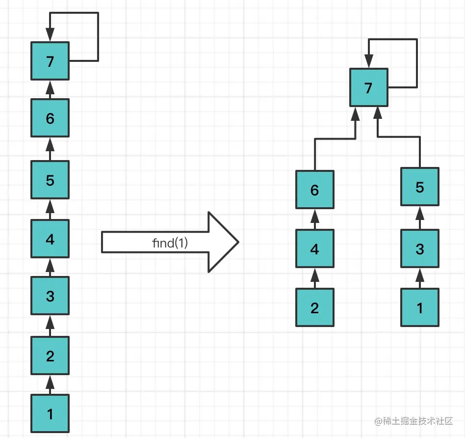 基于rank的优化,树会相对平衡一些,但是随着Union次数的增多,树的高度依然会越来越高,导致find操作变慢,尤其底层节点(因为find是不断向上找到根结点),因此,可以基于路经压缩优化。路经压缩是指在find时该路经上的所有节点都指向根结点,从而降低树的高度。
