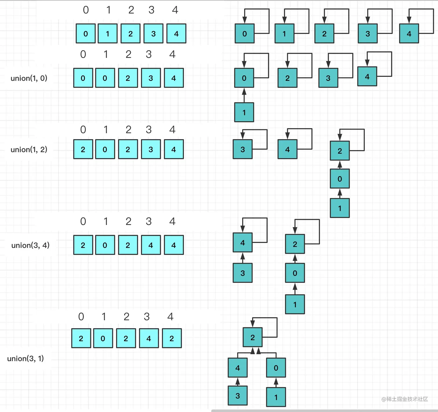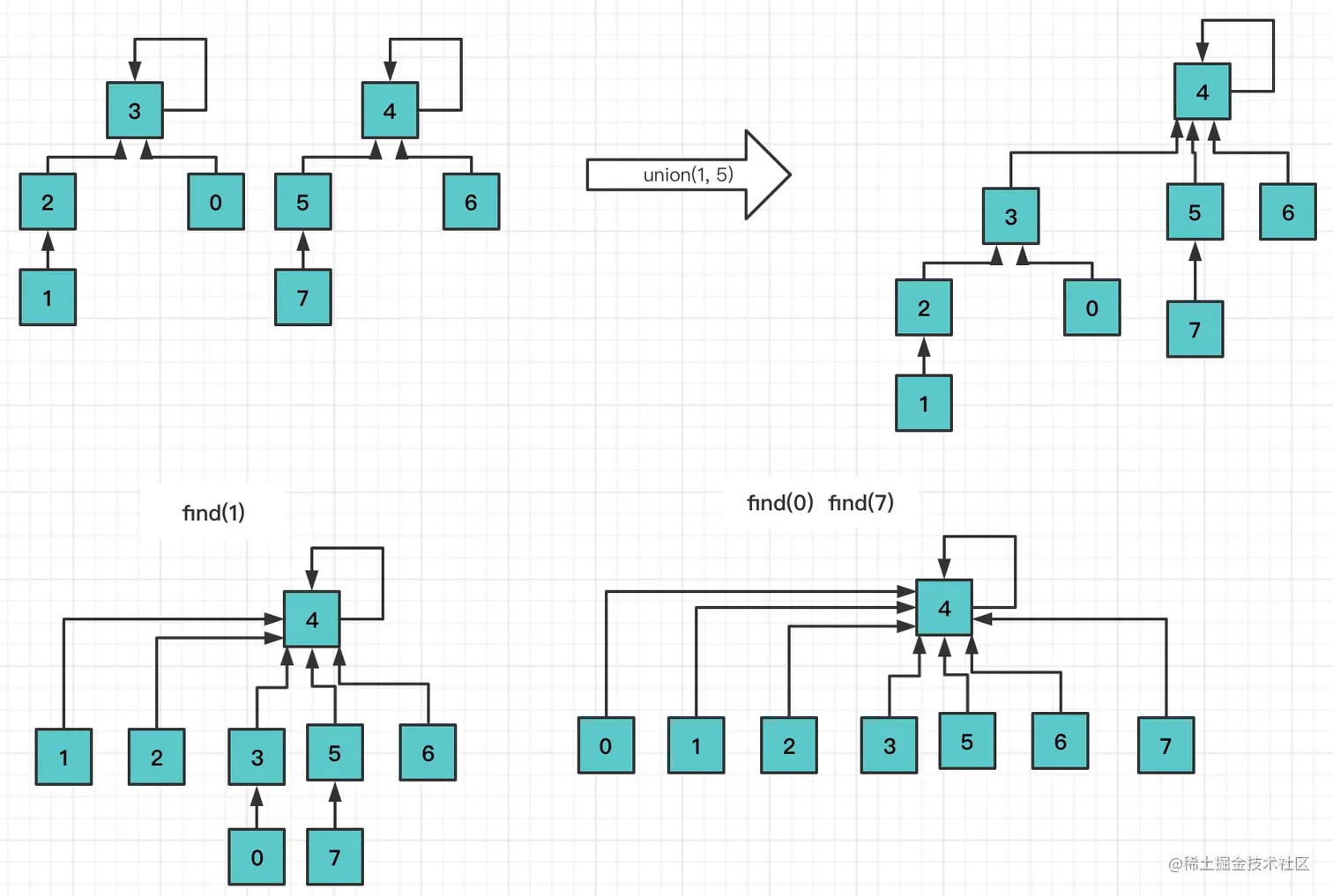 初始化时,每个元素各自属于一个单元素集合