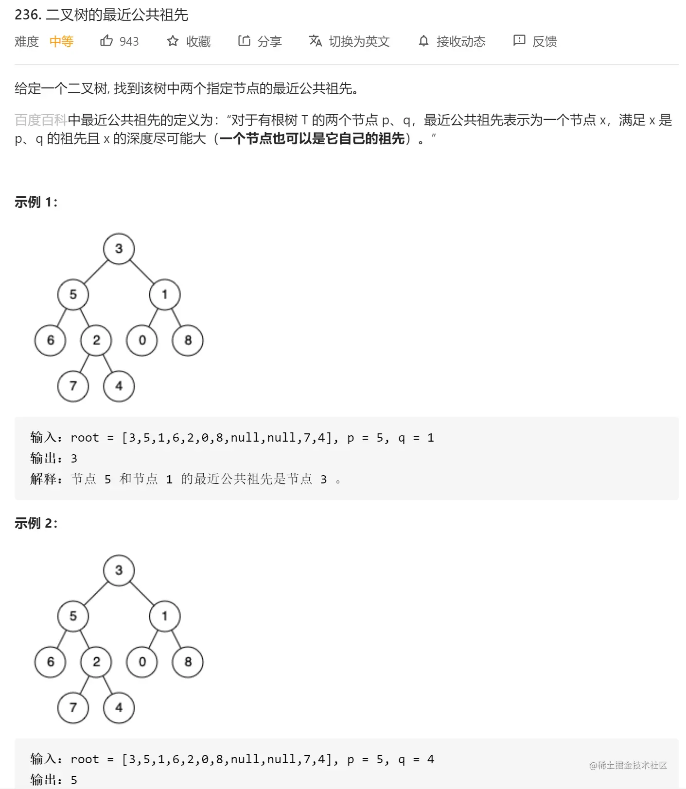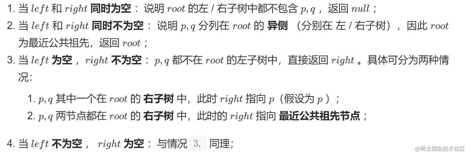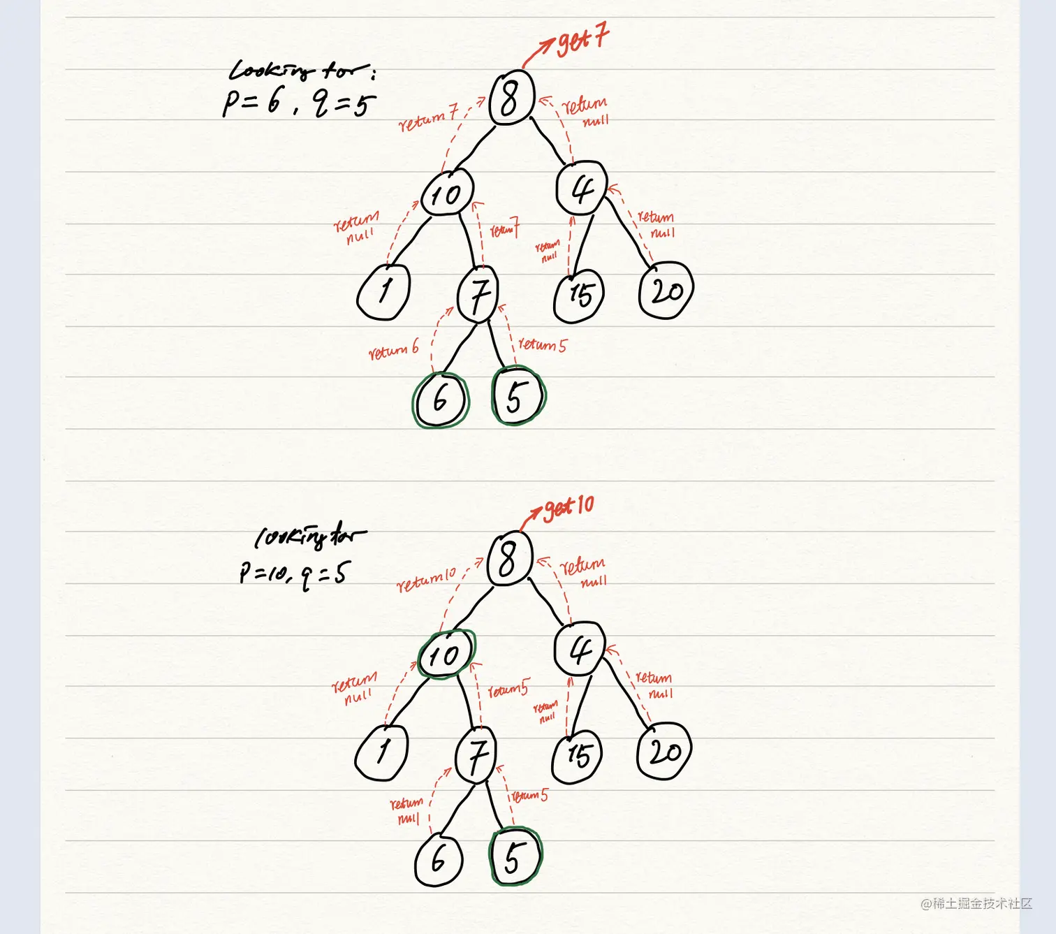 - 如果找到一个节点,发现左子树出现结点p,右子树出现节点q,或者 左子树出现结点q,右子树出现节点p,那么该节点就是节点p和q的最近公共祖先。
