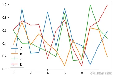df= pd.DataFrame(np.random.rand(12, 4), columns=['A','B','C','D'])