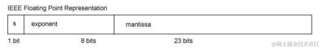 这就要知道计算机是如何表示浮点数的,IEEE754 标准中规定 float 单精度浮点数,在机器中表示用 1 位表示数字的符号,用 8 位表示指数,用 23 位表示尾数,即小数部分,如下图所示: