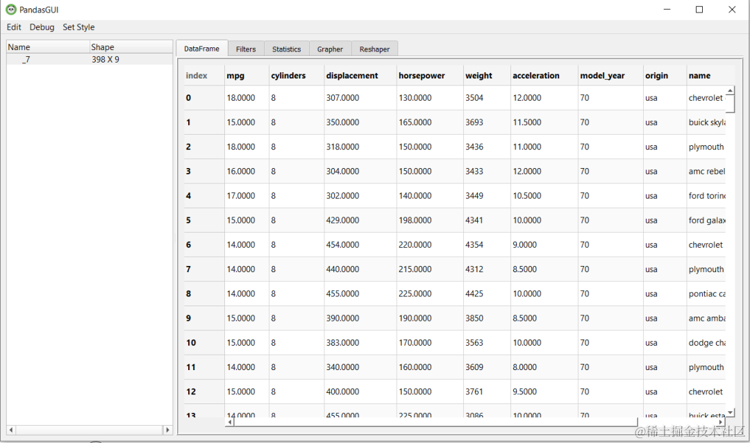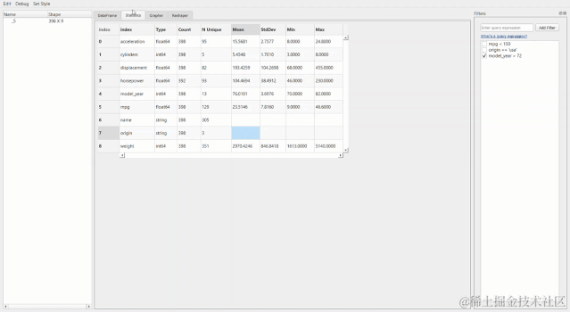 在此GUI中,可以做很多事情,比如过滤、统计信息、在变量之间创建图表、以及重塑数据。这些操作可以根据需求拖动选项卡来完成。