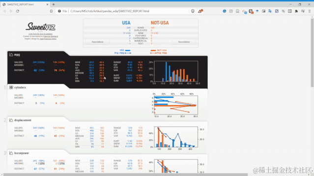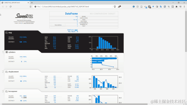 Sweetviz是另一个Python的开源代码包,仅用一行代码即可生成漂亮的EDA报告。与Pandas Profiling的区别在于它输出的是一个完全独立的HTML应用程序。