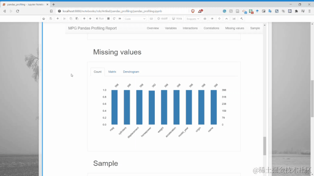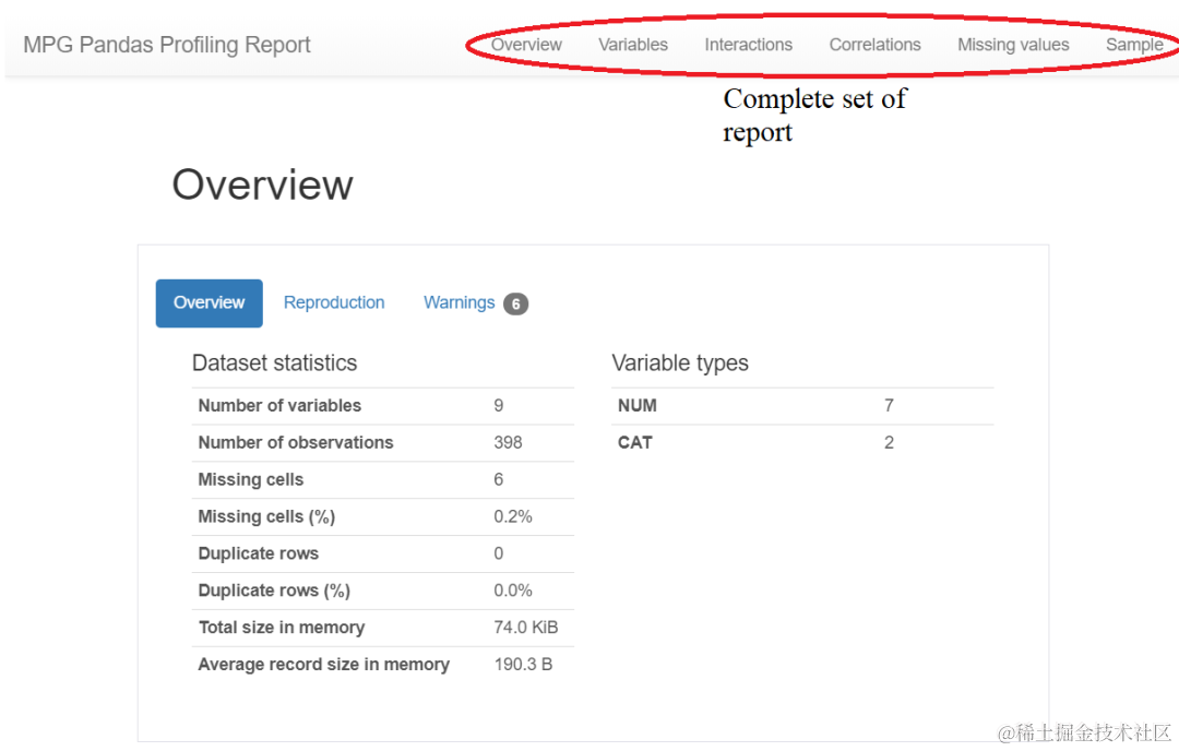 总共提供了六个部分:概述、变量、交互、相关性,缺失值和样本。