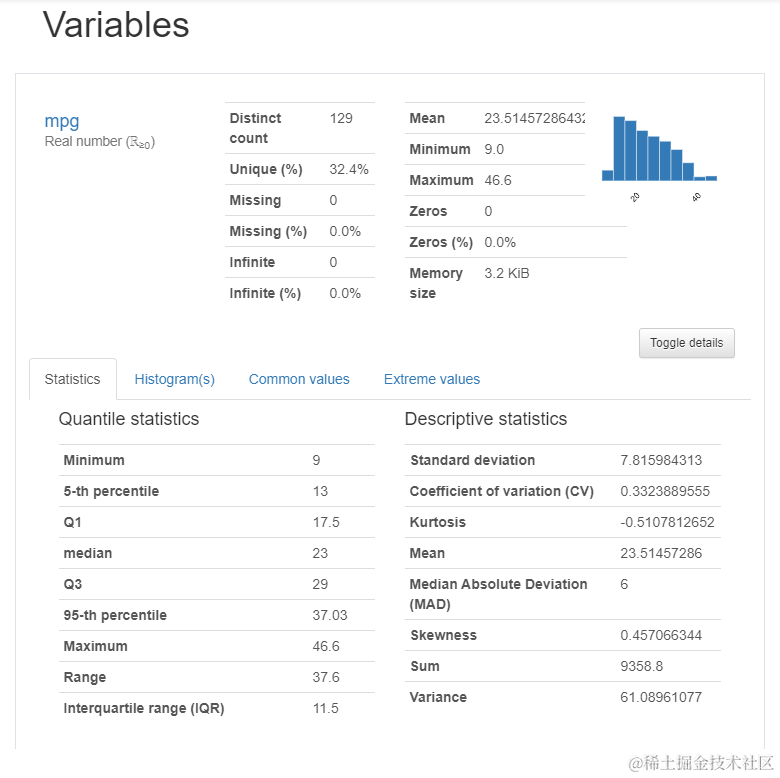 Pandas profiling的变量部分是完整的,它为每个变量都生成了详细的报告。