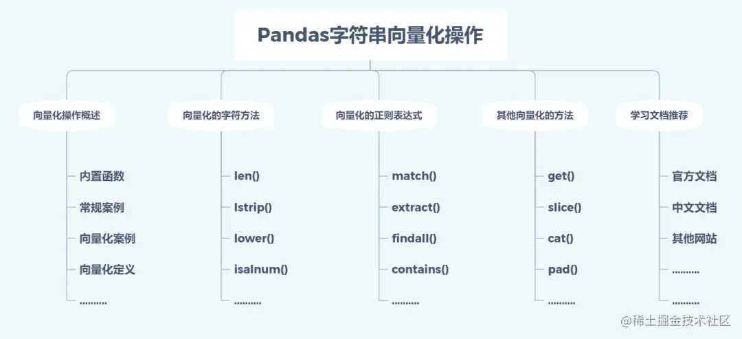向量化的操作使我们不必担心数组的长度和维度,只需要关系操作功能,尤为强大的是,除了支持常用的字符串操作方法,还集成了正则表达式的大部分功能,这使得pandas在处理字符串列时,具有非常大的魔力。