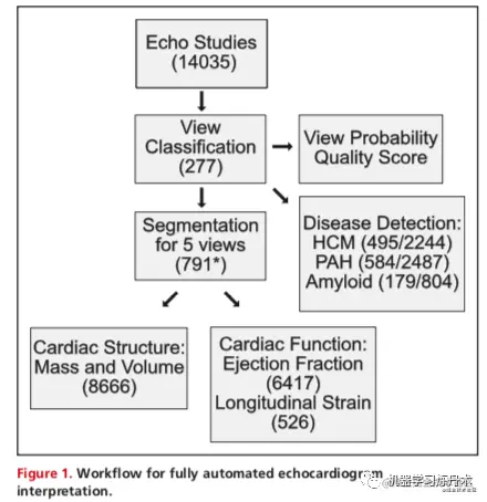 预处理需要自动下载医学格式的数字成像和通信中的超声心动图,从静态图像中分离视频,提取元数据(例如帧速率、心率),将其转换为矩阵计算的数字数组,以及通过覆盖患者健康信息来消除图像的标识。下一步我们使用卷积神经网络(稍后描述)来自动确定超声心动图视图。【这一步应该就是对图进行分类】,根据确定的视图,视频被路由到特定的分割模型(胸骨旁长轴[PLAX]、胸骨旁短轴、心尖2腔[A2c]、api-cal3腔和心尖4腔[A4c])【这里知道应该是一个5分类的任务】,输出用于推导腔室测量值,包括长度、面积、体积和质量估计值。接下来,我们生成了两种常用的左心室功能自动测量方法:射血分数和纵向应变。最后,我们建立了检测3种疾病的模型:肥厚型心肌病、肺动脉高压和心脏淀粉样变性。