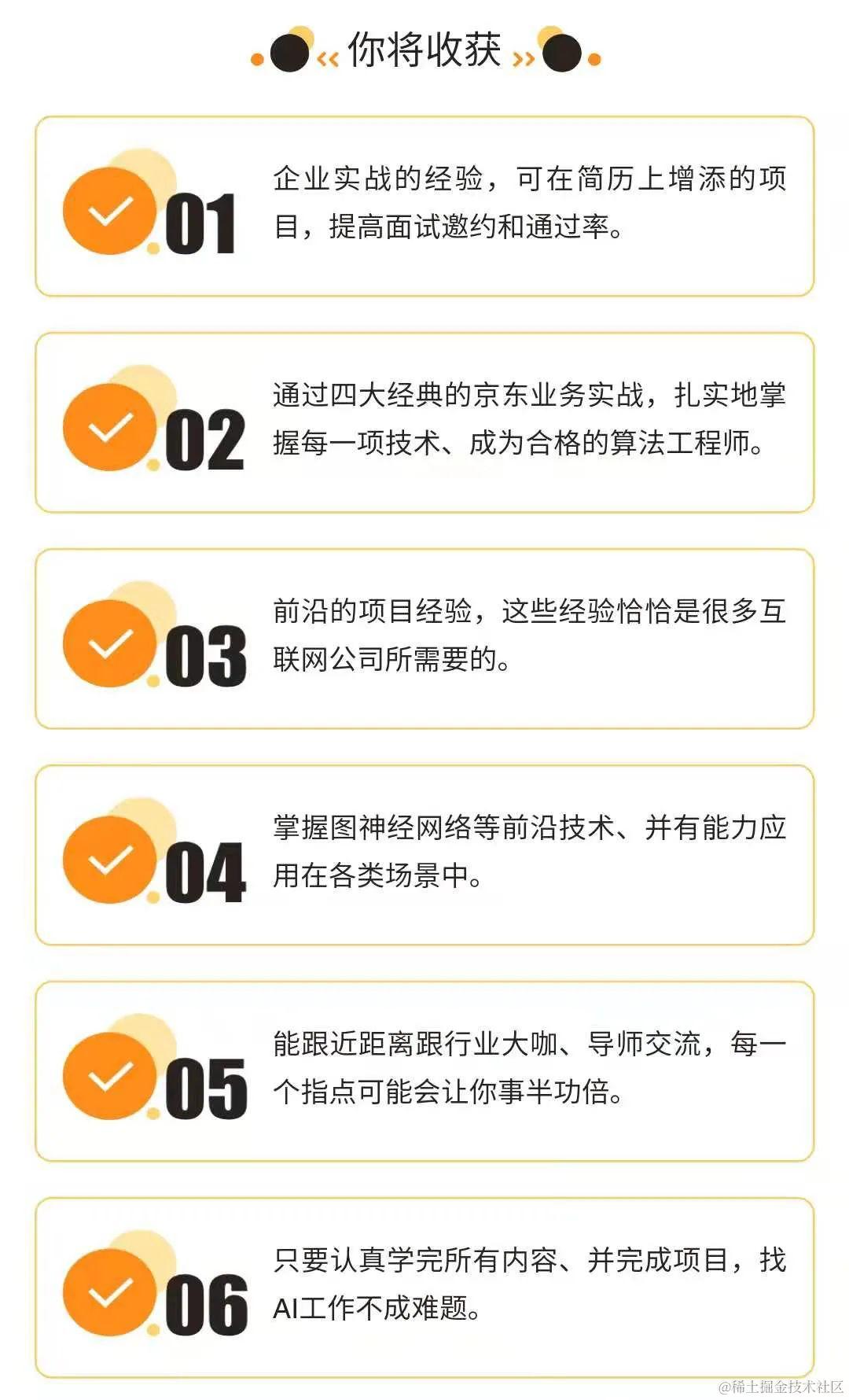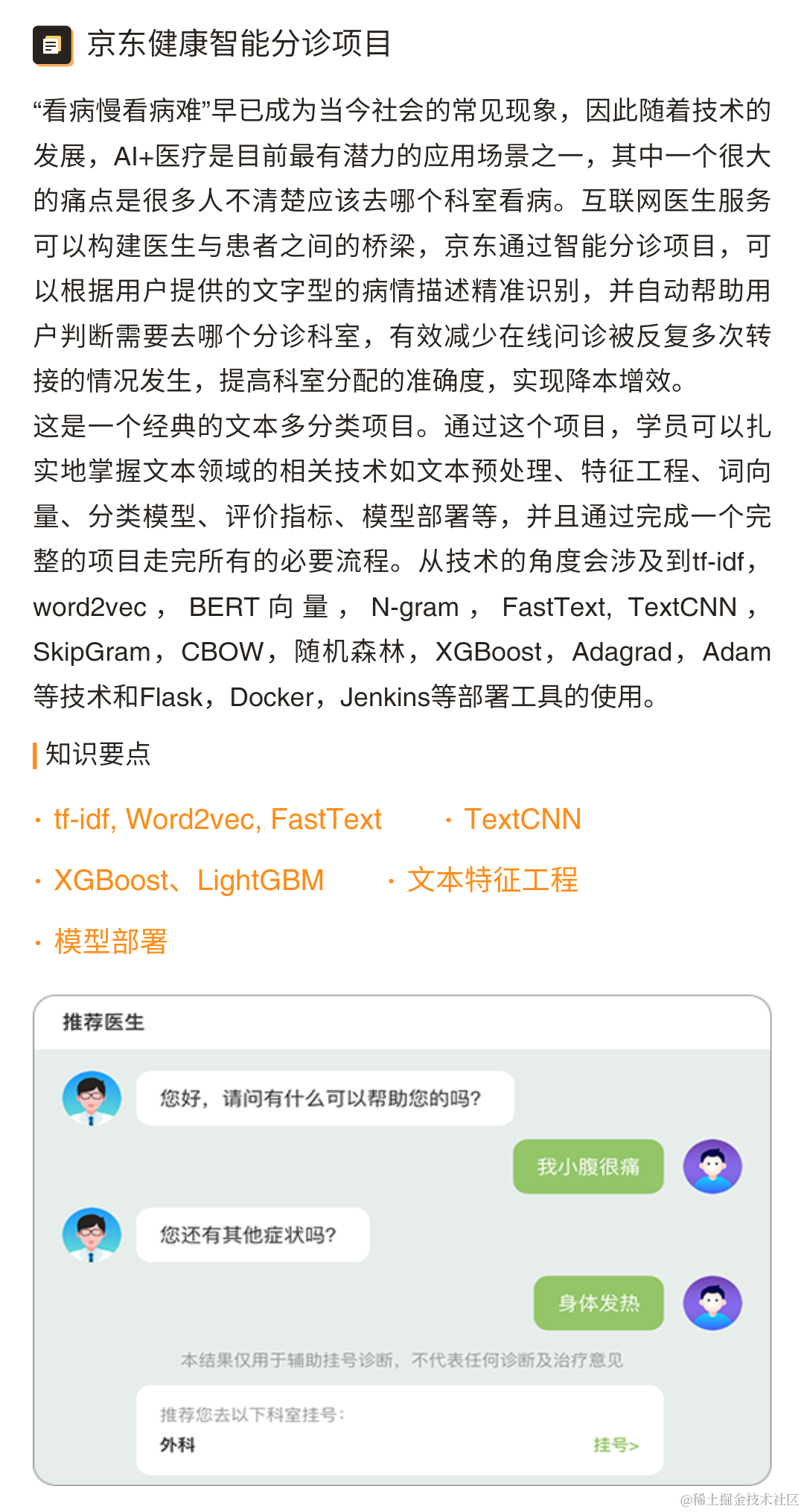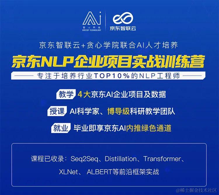 京东智联云联合贪心科技推出了《京东NLP 项目实战训练营》,让学员通过4个月完成4个非常具有挑战的京东落地应用项目,智能医疗分诊项目、智能营销文案生成项目、智能客服系统项目、同类商品搜索项目。 完成这些项目的同时,你也会学会使用BERT, GCN, GAT等前沿技术原理和应用。
