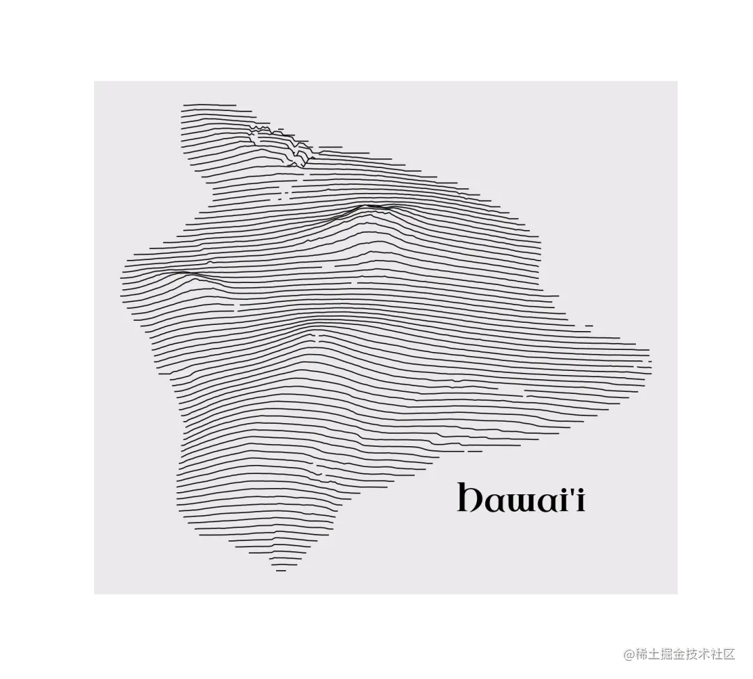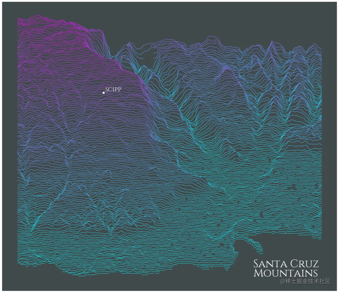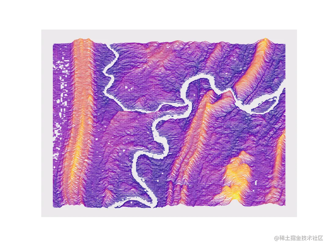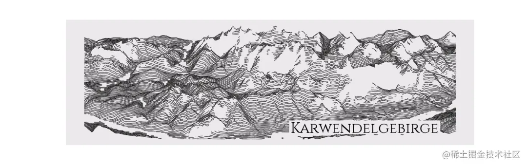 类似图1的风格,在地图制作中也存在着一种**「山脊地图」,基于记录地表海拔信息的「高程数据」**,我们可以利用水平方向上的基于实际位置海拔高度的曲线,来对某块区域的地形进行更具艺术性的表达。