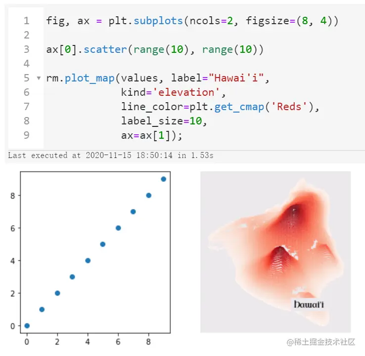 因为ridge_map基于的是matplotlib,所以我们可以类似geopandas绘图那样,在调用plot_map时向ax参数传入已经存在的Axes对象,从而结合不同类型的图像,就像下面这个简单的例子一样: