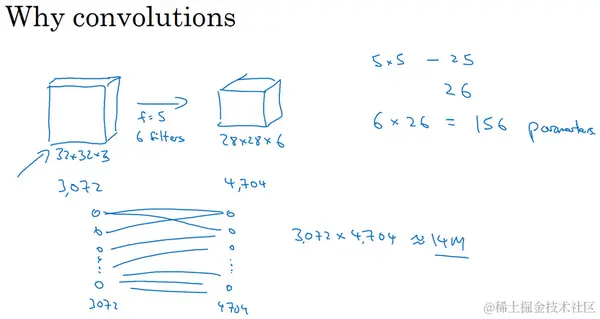 假设有一张32×32×3维度的图片,这是上节课的示例,假设用了6个大小为5×5的过滤器,输出维度为28×28×6。32×32×3=3072,28×28×6=4704。我们构建一个神经网络,其中一层含有3072个单元,下一层含有4074个单元,两层中的每个神经元彼此相连,然后计算权重矩阵,它等于4074×3072≈1400万,所以要训练的参数很多。虽然以现在的技术,我们可以用1400多万个参数来训练网络,因为这张32×32×3的图片非常小,训练这么多参数没有问题。如果这是一张1000×1000的图片,权重矩阵会变得非常大。我们看看这个卷积层的参数数量,每个过滤器都是5×5,一个过滤器有25个参数,再加上偏差参数,那么每个过滤器就有26个参数,一共有6个过滤器,所以参数共计156个,参数数量还是很少。