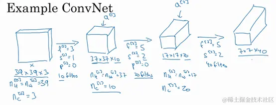 假设第一层我们用一个3×3的过滤器来提取特征,那么 ,因为过滤器时3×3的矩阵。 , ,所以高度和宽度使用valid卷积。如果有10个过滤器,神经网络下一层的激活值为37×37×10,写10是因为我们用了10个过滤器,37是公式 的计算结果,也就是 ,所以输出是37×37,它是一个vaild卷积,这是输出结果的大小。第一层标记为 , , 等于第一层中过滤器的个数,这(37×37×10)是第一层激活值的维度。