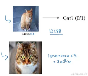 如果你要操作更大的图片,比如一张1000×1000的图片,它足有1兆那么大,但是特征向量的维度达到了1000×1000×3,因为有3个RGB通道,所以数字将会是300万。如果你在尺寸很小的屏幕上观察,可能察觉不出上面的图片只有64×64那么大,而下面一张是1000×1000的大图。