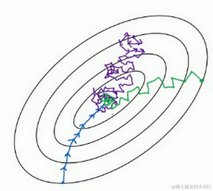 相反,在随机梯度下降法中,从某一点开始,我们重新选取一个起始点,每次迭代,你只对一个样本进行梯度下降,大部分时候你向着全局最小值靠近,有时候你会远离最小值,因为那个样本恰好给你指的方向不对,因此随机梯度下降法是有很多噪声的,平均来看,它最终会靠近最小值,不过有时候也会方向错误,因为随机梯度下降法永远不会收敛,而是会一直在最小值附近波动,但它并不会在达到最小值并停留在此。