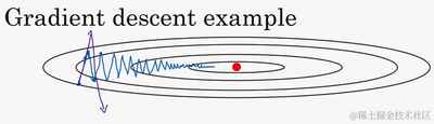 例如,如果你要优化成本函数,函数形状如图,红点代表最小值的位置,假设你从这里(蓝色点)开始梯度下降法,如果进行梯度下降法的一次迭代,无论是batch或mini-batch下降法,也许会指向这里,现在在椭圆的另一边,计算下一步梯度下降,结果或许如此,然后再计算一步,再一步,计算下去,你会发现梯度下降法要很多计算步骤对吧?