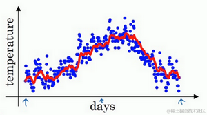 第二天,又可以获得一个加权平均数,0.9乘以之前的值加上当日的温度0.1倍,即 ,以此类推。