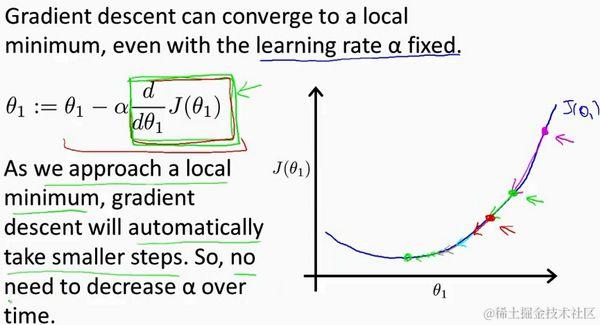 假设你将 初始化在局部最低点,在这儿,它已经在一个局部的最优处或局部最低点。结果是局部最优点的导数将等于零,因为它是那条切线的斜率。这意味着你已经在局部最优点,它使得 不再改变,也就是新的 等于原来的 ,因此,如果你的参数已经处于局部最低点,那么梯度下降法更新其实什么都没做,它不会改变参数的值。这也解释了为什么即使学习速率 保持不变时,梯度下降也可以收敛到局部最低点。