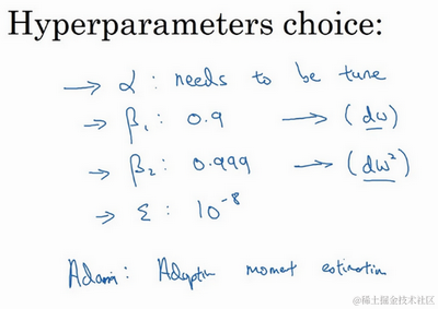 本算法中有很多超参数,超参数学习率 很重要,也经常需要调试,你可以尝试一系列值,然后看哪个有效。 常用的缺省值为0.9,这是dW的移动平均数,也就是 的加权平均数,这是Momentum涉及的项。至于超参数 ,Adam论文作者,也就是Adam算法的发明者,推荐使用0.999,这是在计算 以及 的移动加权平均值,关于 的选择其实没那么重要,Adam论文的作者建议 为 ,但你并不需要设置它,因为它并不会影响算法表现。但是在使用Adam的时候,人们往往使用缺省值即可, , 和 都是如此,我觉得没人会去调整 ,然后尝试不同的 值,看看哪个效果最好。你也可以调整 和 ,但我认识的业内人士很少这么干。