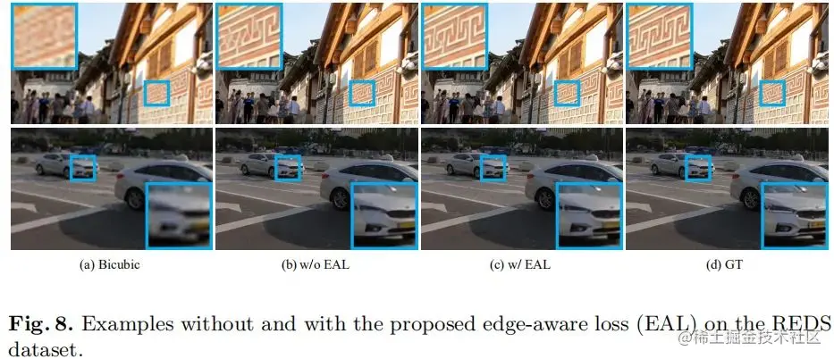 已有视频超分方案在重建的高分辨率图像中边缘往往存在锯齿问题,为缓解该问题,作者提出了一种edge-aware损失以更好的调整边缘。首先,采用边缘检测器提取GT图像的边缘信息;然后,对于边缘区域赋予更多的损失权重以迫使网络在这些区域赋予更多的注意力。