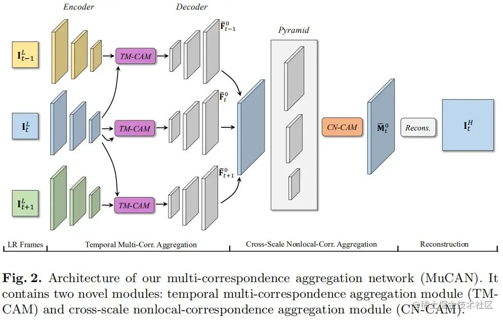 上图给出了本文所提出的MuCAN网络结构示意图。它以 个连续低分辨率图像 作为输入,输出中间帧的高分辨率图像 。它包含三个关键模块:TM-CAM、CN-CAM以及重建模块。接下来,我们将分别针对三个模块进行详细介绍。