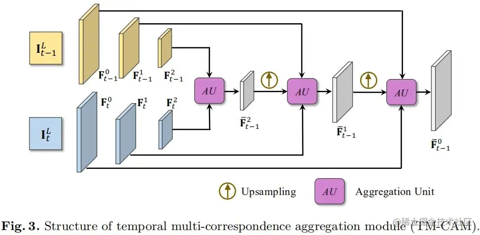 相邻帧见的运动具有正反两方面性:一方面,大的运动需要进行消除以构建相似内容的相关性;另一方面,小运动的精确估计非常重要,它是细节的增强的根源。受FlowNet与PWCNet启发,作者设计了一种分层相关集成策略以更好的同时处理大运动和小运动,见下图。