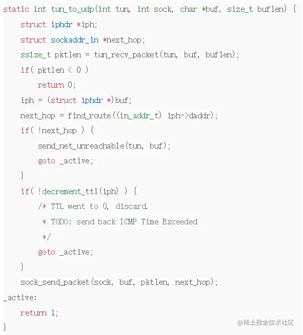 在flannel的源码中,flanneld是由c语言直接实现的,关键代码在/backend/udp/proxy_adm64.c,而kube-flannel则是由go语言实现的,关键部分在/backend/udp/cproxy_adm64.go。 proxy_adm64.c中最关键的就是tun_to_udp和udp_to_tun,光是看名字就已经明白了用途,而且代码还贼精简:
