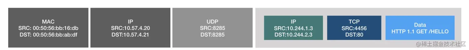 5.flanneld查看数据包的IP头,发现目的地是10.244.2.3,于是从自己的路由中找去这个目的地下一跳,从kube-flannel传来的信息指示10.244.2.0/24这个子网在主机10.57.4.21上(这一步已经在kube-flannel和flanneld进程启动后就立刻完成了),于是flanneld进程经过一些必要的处理后,把从tun0来的数据包(包括TCP头、IP头)当成数据,通过打开的udp端口发往了10.57.4.21的UDP8285端口。