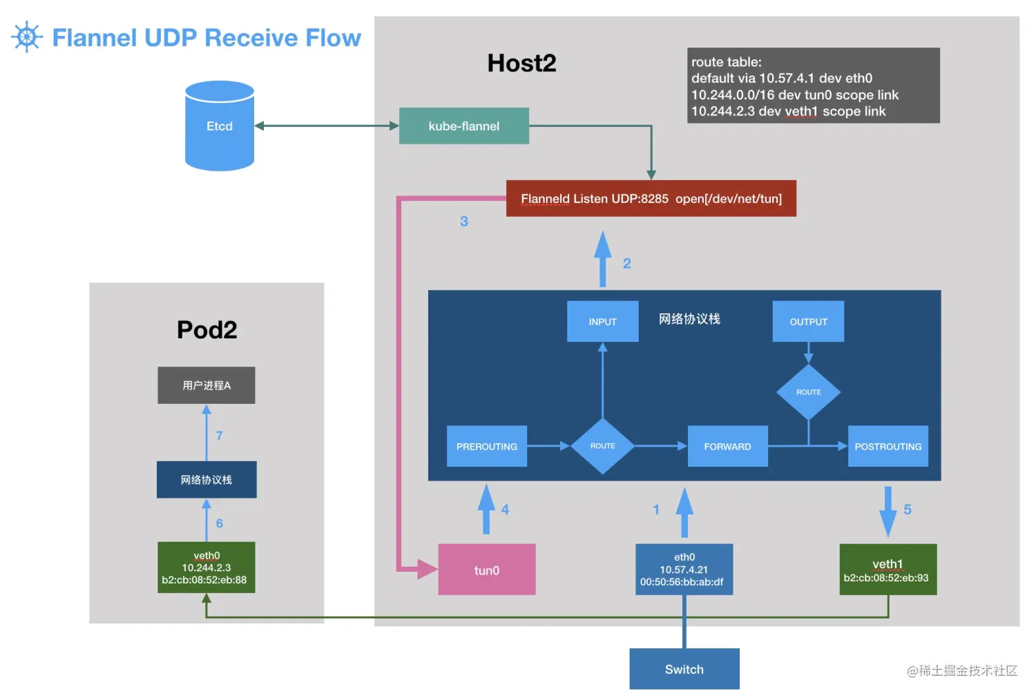 1.数据包从pod1的用户进程出来,进入pod1的协议栈,协议栈发现要去往目的地并非在相同网段,于是设置了下一跳为默认网关169.254.2.2,通过ARP查到默认网关的IP对应的MAC为主机veth1的MAC地址,于是把veth1的MAC地址填进目标MAC地址,完成MAC头的封装,把包发送到veth1,进入主机host1的网络协议栈。