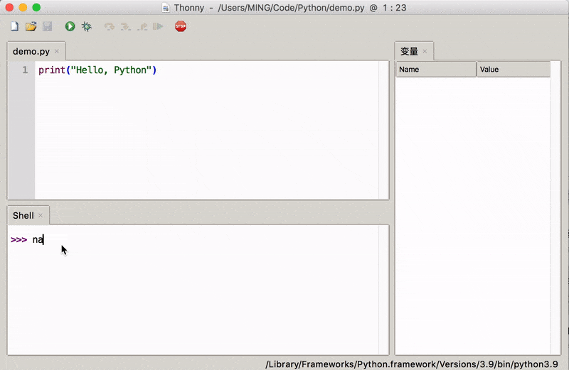 同时作为一款简易的 IDE , Thonny 同时也是支持代码补全,只不过这代码补全并不是那么智能,需要按下快捷键(⌃ + s)来手动触发。