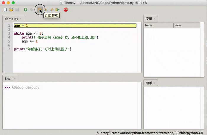 别急,请你接着往下看,Thonny 中的步进调试达到的效果,就算是 PyCharm 也还没有做到如此便于新手学习的调试体验。