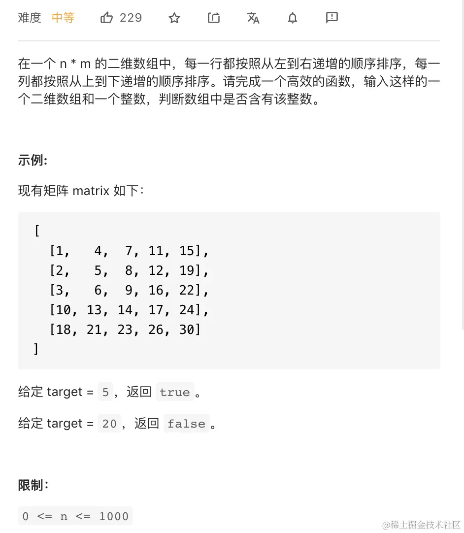 时间复杂度:O(n+m)O(n+m)。访问到的下标的行最多增加 n 次,列最多减少 m 次,因此循环体最多执行 n + m 次。 空间复杂度:O(1)O(1)。