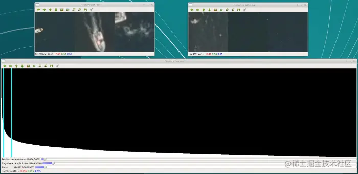 迭代方法的结果是对880万个片段进行排序,基于在交互细化过程中选择的片段的平均相似距离。理想情况下,应该有个边界,前N个片段包含船只,剩下的片段是没有的。然而,在实际中,更确切地说,是前M个片段包含船只,之后在片段M和片段N之间有一个间隔,其中一些包含船只,而不是所有都包含船只。在M之后的片段被假设不包含船,以避免误报。我们创建了一个快速而粗糙的用户界面,用户可以在其中检查已排序的片段,并为M和N建立一些有用的值。