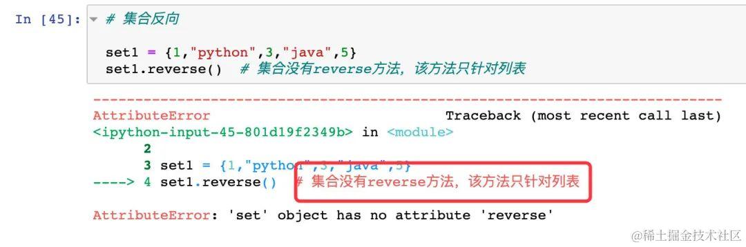 set1.reverse() # 集合没有reverse方法,该方法只针对列表