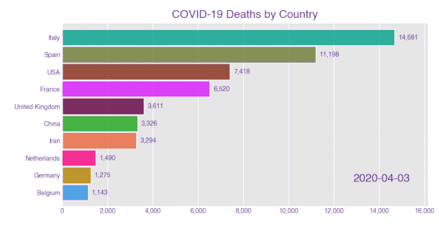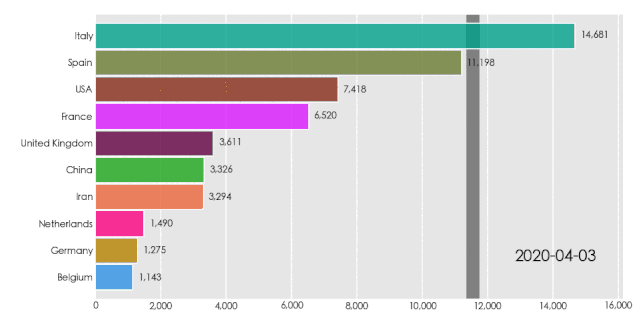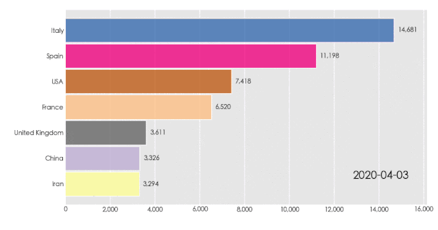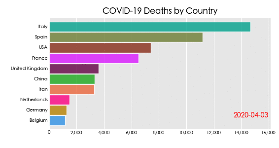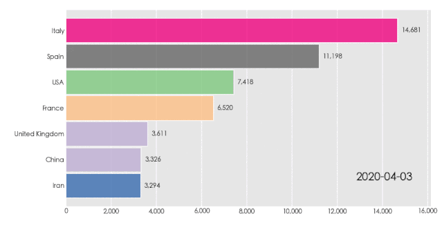#设置文本位置、数值、大小、颜色等def summary(values, ranks): total_deaths = int(round(values.sum(), -2)) s = f'Total Deaths - {total_deaths:,.0f}'return {'x': .99, 'y': .05, 's': s, 'ha': 'right', 'size': 8}# 添加文本bcr.bar_chart_race(df, 'covid19_horiz.gif', period_summary_func=summary
