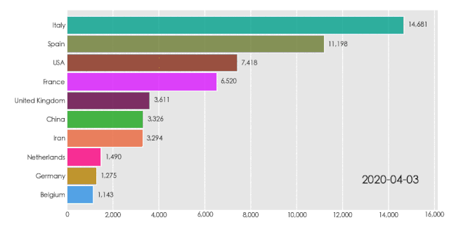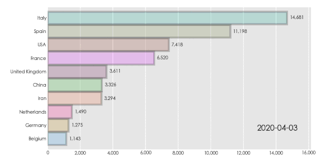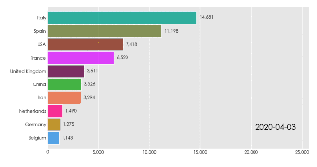 # 选取如下5个国家的数据 fixed_orderbcr.bar_chart_race(df, 'covid19_horiz.gif', fixed_order=['Iran', 'USA', 'Italy', 'Spain', 'Belgium'])