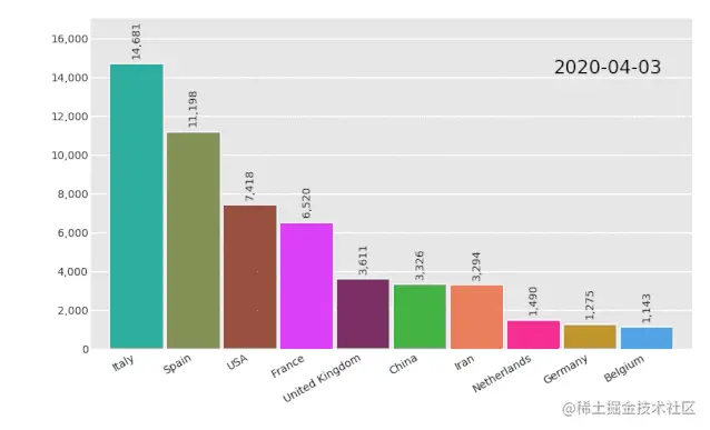# 设置日期格式,默认为'%Y-%m-%d'bcr.bar_chart_race(df, 'covid19_horiz.gif', period_fmt='%b %-d, %Y')