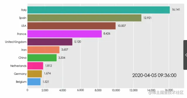 #加载包import bar_chart_race as bcr#下载数据df = bcr.load_dataset('covid19_tutorial')#生成GIF图像bcr.bar_chart_race(df, 'covid19_horiz.gif')#生成MP4bcr.bar_chart_race(df, 'covid19_horiz.MP4')
