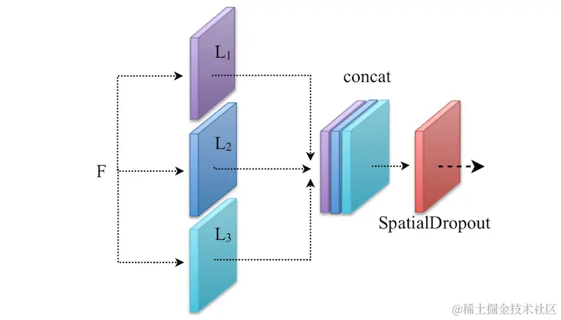 如果你有两个或更多的卷积层(比如Li)对相同的输入(比如F)进行操作(参考下面的示意图理解),那么在特征连接后使用SpatialDropout。由于这些卷积层是在相同的输入上操作的,因此输出特征很可能是相关的。因此,SpatialDropout删除了那些相关的特征,并防止网络中的过拟合。