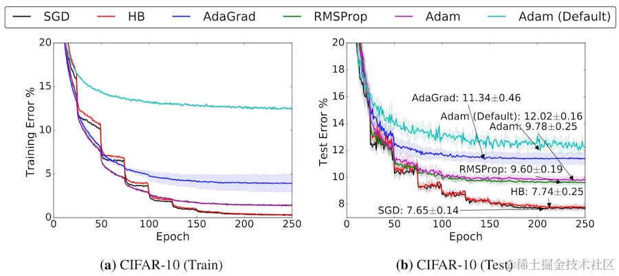 第二,SGD+momentum可以实现找到全局最小值,但它依赖于鲁棒初始化,而且可能比其他自适应优化器需要更长的时间来收敛(下图)。我建议你使用SGD+动量,因为它能达到更好的最佳效果。
