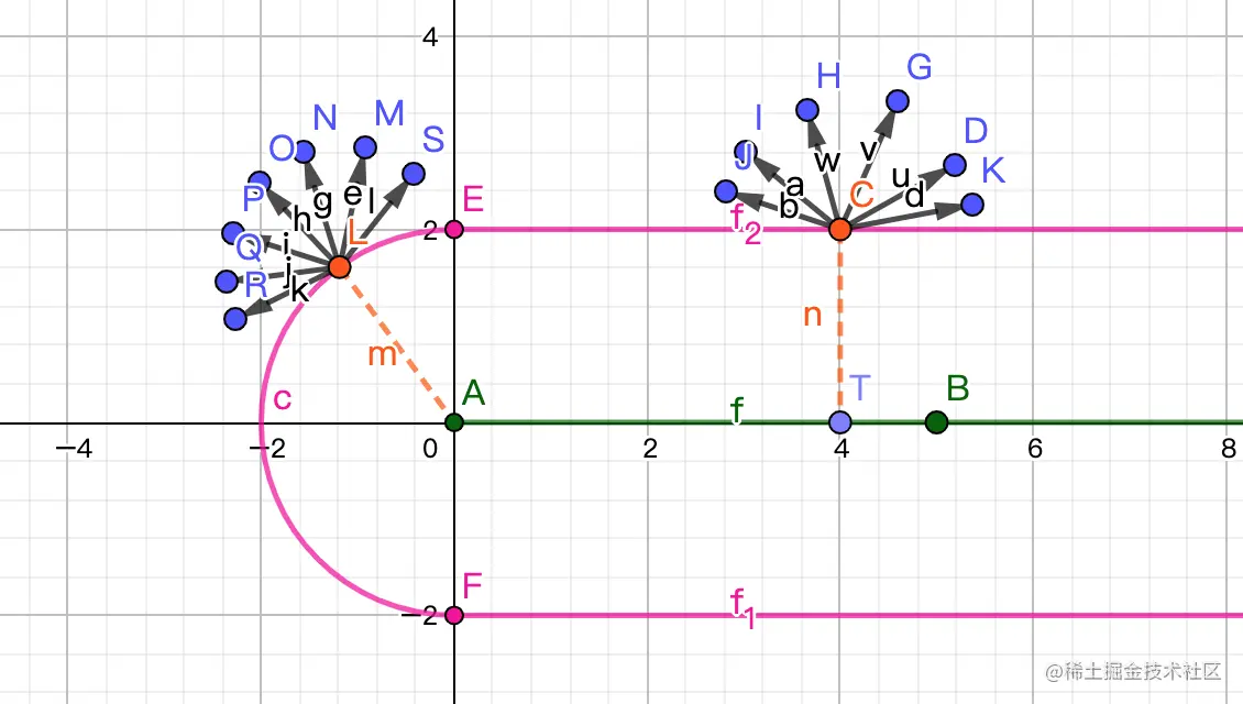 再假设,如果另一条射线起点是点 L,它到射线 AB 的最近点是 A,也就是射线 AB 的起点。那判断标准也是一样,当从点 L 出发的射线,与向量 AL 点乘结果为正时,就远离。