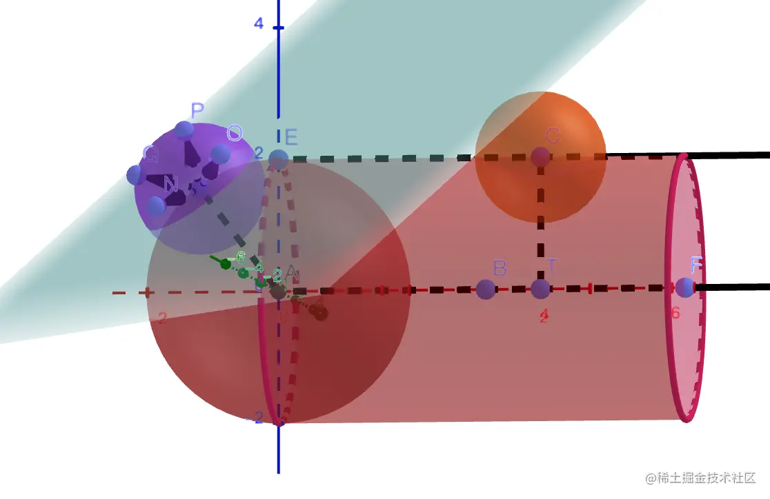 我们先来考虑起点是点 C 时的情况,这两种情况如何区分呢?从下图看出,分界线就是点 A 与点 C 的连线,那么如何判断它们的位置关系呢,尤其是在三维空间中,更为困难