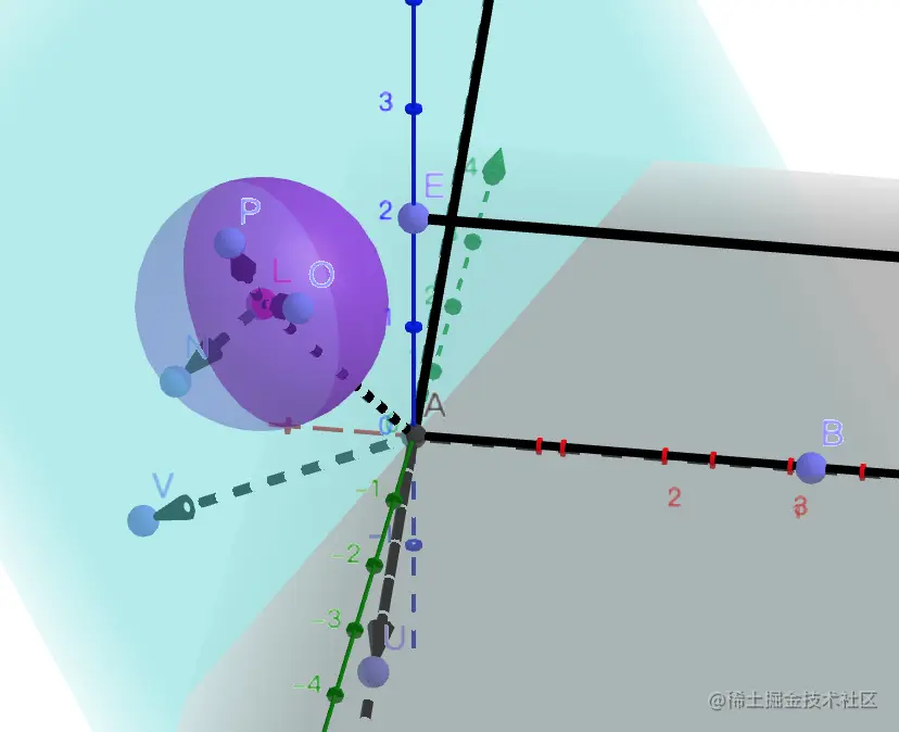 那么当射线起点是点 L 时,上面方法还适用么?当然是适用的。我们先利用 AB、AL 叉乘,得到 AU,再用 AU、AL 叉乘,得到向量 AV,这就是我们要的法线方向。最后我们判断向量 LP、LO、LN 与 AV 的点乘,结果为正时,说明另一条射线朝向 AB 的负方向;为负时,朝向正方向,可以按两条直线的最近点处理。