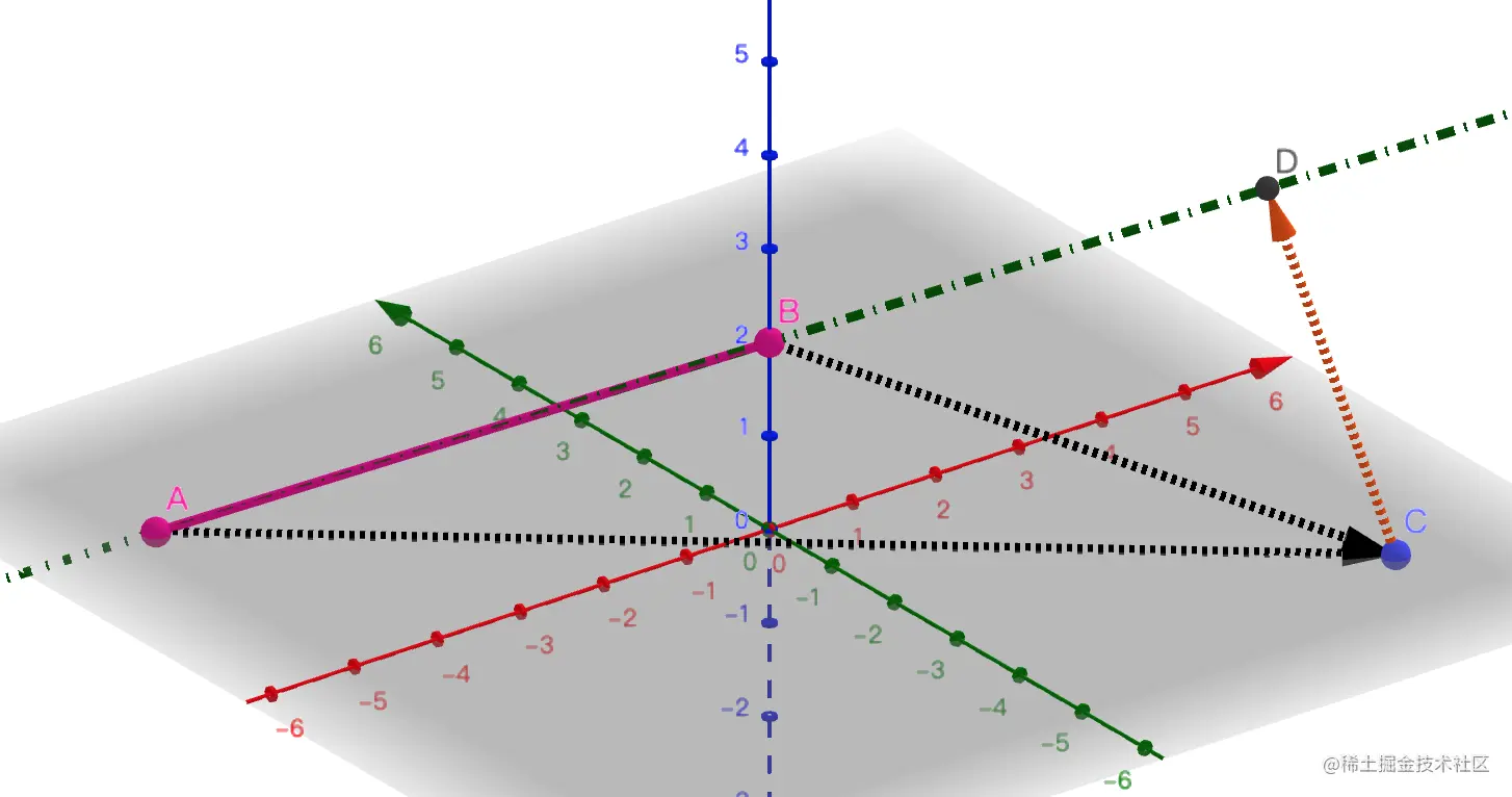 可以看到,点 C 到射线 AB 的最近点是 D,但点 C 到射线 BA 的最近点是点 B。