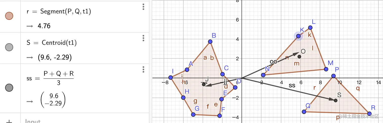 我们依次取多边形的两个顶点,再加上坐标原点(0, 0, 0),就构成了一个小三角形。这个小三角形的重心很好求,就是两个顶点的平均值,而面积也可以用向量叉乘来计算。