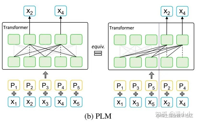 - PLM中,每个被预测的token只能“看”到被打乱的序列中位于它自己前面的token,而不能像MLM一样“看”到两侧的token。