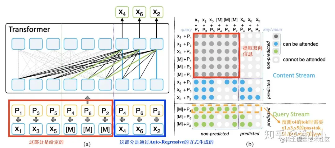 - (b)图中蓝色和绿色的部分分别是decoder端的two stream self-attention的content stream和query stream (two stream self-attention的具体定义请参考 【论文串讲】从GPT和BERT到XLNet ),这里提一下,content stream相当于query stream右移一步。