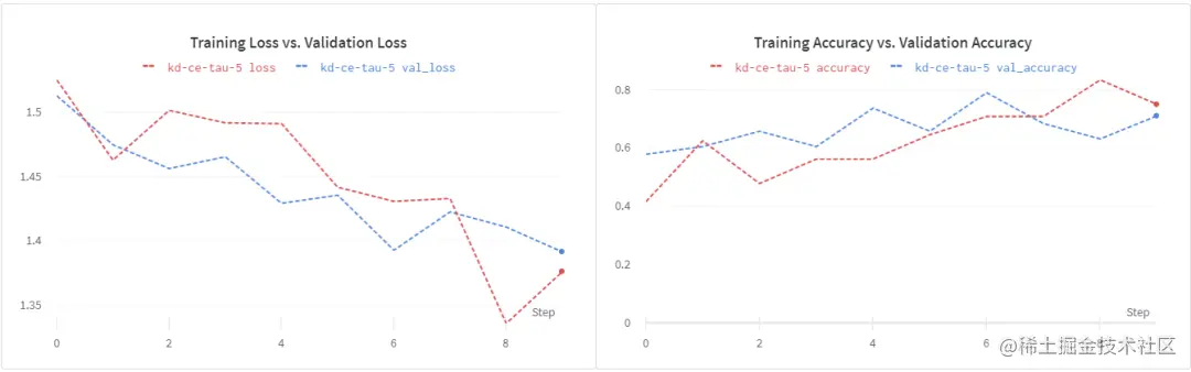 现在让我们看看在蒸馏训练目标中加入ground truth标签是否有帮助。在β = 0.1和α = 0.1的情况下,我们得到了大约71%的验证准确性。再次表明,更强的正则化和更长的训练时间会有所帮助。